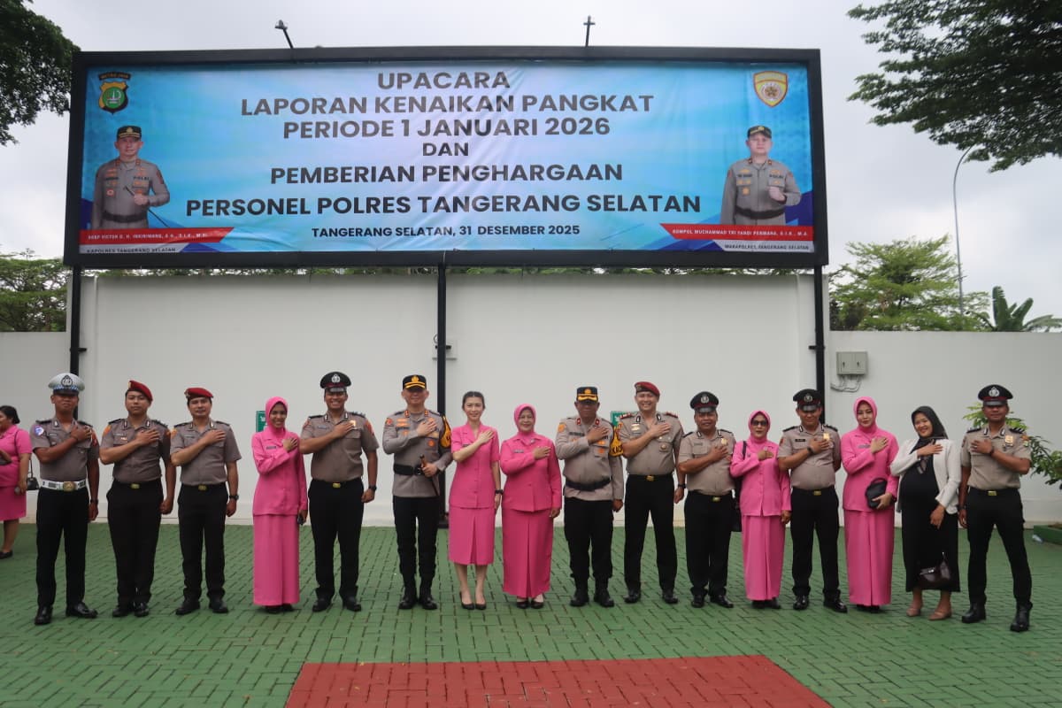 Rakyatmerdekanews.co.id, Tangsel – Sebanyak 102 (seratus dua) personel Polres Tangerang Selatan resmi dinaikkan pangkat setingkat lebih tinggi, terlihat dalam Upacara Kenaikan Pangkat Periode 1 Januari 2026 yang dilaksanakan di Lapangan Apel Polres Tangerang Selatan, Rabu (31/12/2025).