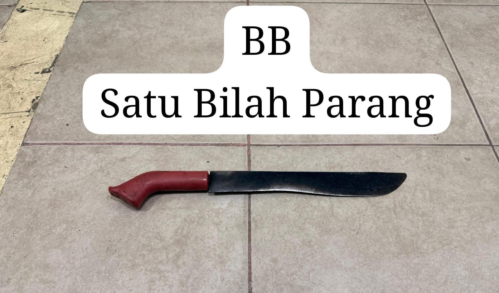 Sebilah parang bergagang merah sepanjang 44 cm (senjata tajam yang digunakan pelaku).