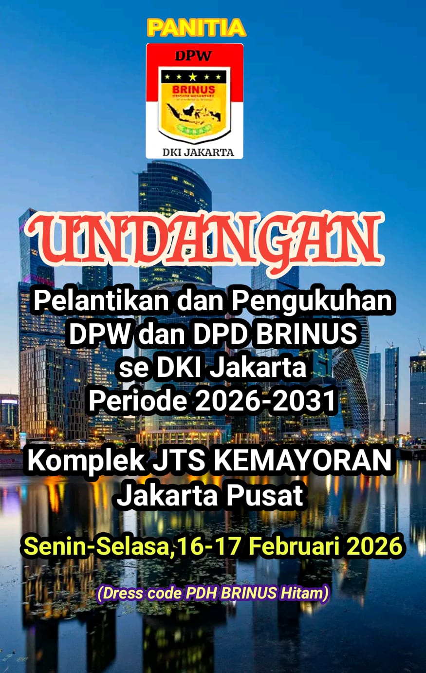 Jakarta — Bakal digelar acara pelantikan dan pengukuhan pengurus DPW dan DPD BRINUS se-wilayah DKI Jakarta. Bertempat di komplek JTS, Kemayoran, Jakarta Pusat, pada Selasa 17 Pebruari 2026, pukul 19.00 WIB. Kegiatan ini sesuai hasil rapat BRINUS sebelumnya.Brigade Nusantara adalah organisasi kemasyarakatan di Indonesia yang berfokus pada komitmen kebangsaan, pembangunan karakter, dan kontribusi nyata untuk kemajuan bangsa. Brinus bergerak dalam kegiatan sosial, politik (termasuk Pilkada), dan menjaga kedaulatan NKRI.
