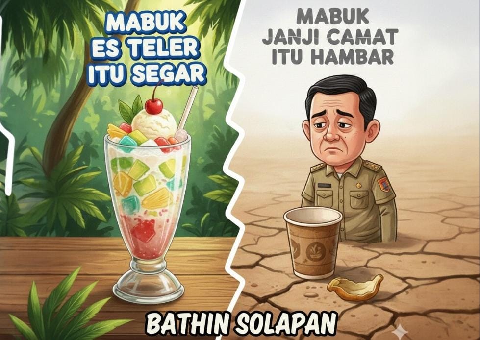 Namun, di balik segarnya segelas es teler yang menemani sore itu, terselip ironi mendalam yang dirasakan warga. Jika es teler membuat orang “mabuk” karena kelezatannya, kepemimpinan di Kecamatan Bathin Solapan justru dinilai membuat warga “mabuk” akibat deretan janji manis yang tak kunjung terealisasi.