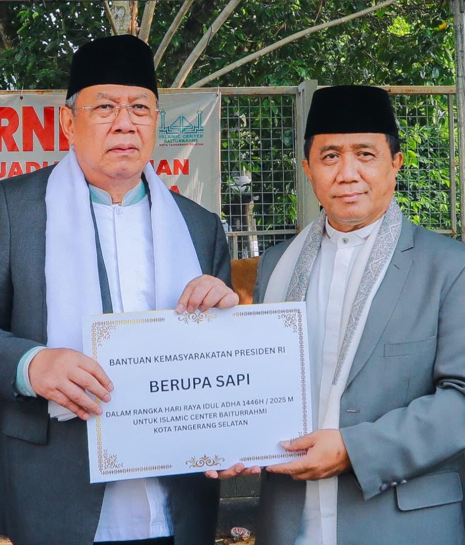 Ketua Harian Badan Pengelola Islamic Center Baiturrahmi, Dadang Raharja menerima langsung penyerahan Batalion Hewan Kurban Sapi dari Presiden Prabowo dan sekaligus juga menerima penyerahan Hewan Kurban dari pemerintah Kota Tangerang Selatan oleh Walikota Tangerang Selatan – Benyamin Davnie pada Jumat pagi, (06/06/2025) setelah penyelenggaraan sholat Idul Adha di Masjid Islamic Center Baiturrahmi.