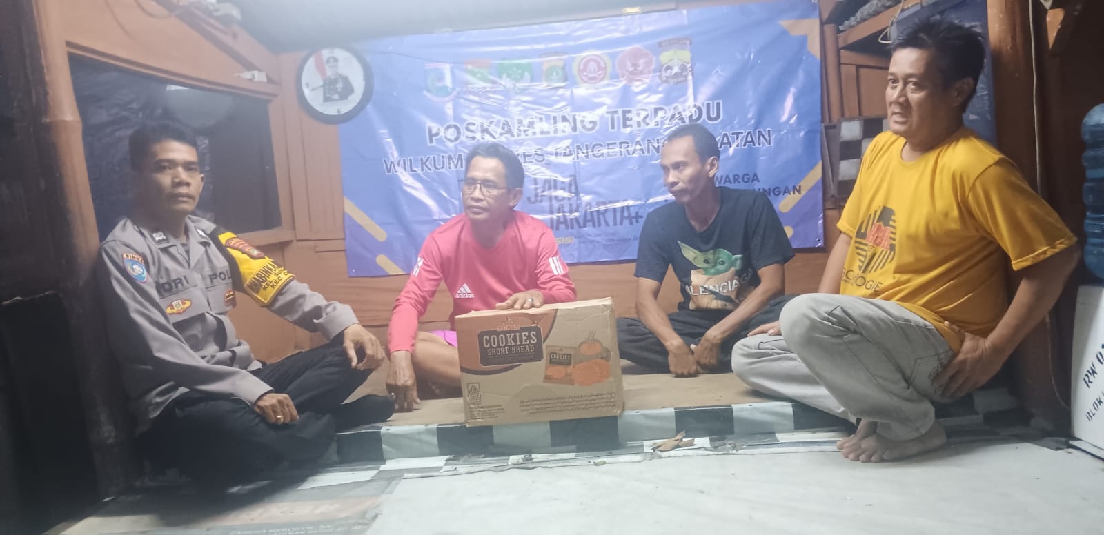 Bhabinkamtibmas memberikan sarana kontak berupa satu dus makanan ringan kepada warga yang berjaga. Hal ini diharapkan dapat menambah semangat masyarakat dalam menjaga keamanan lingkungan sekaligus mempererat kedekatan antara kepolisian dan warga.