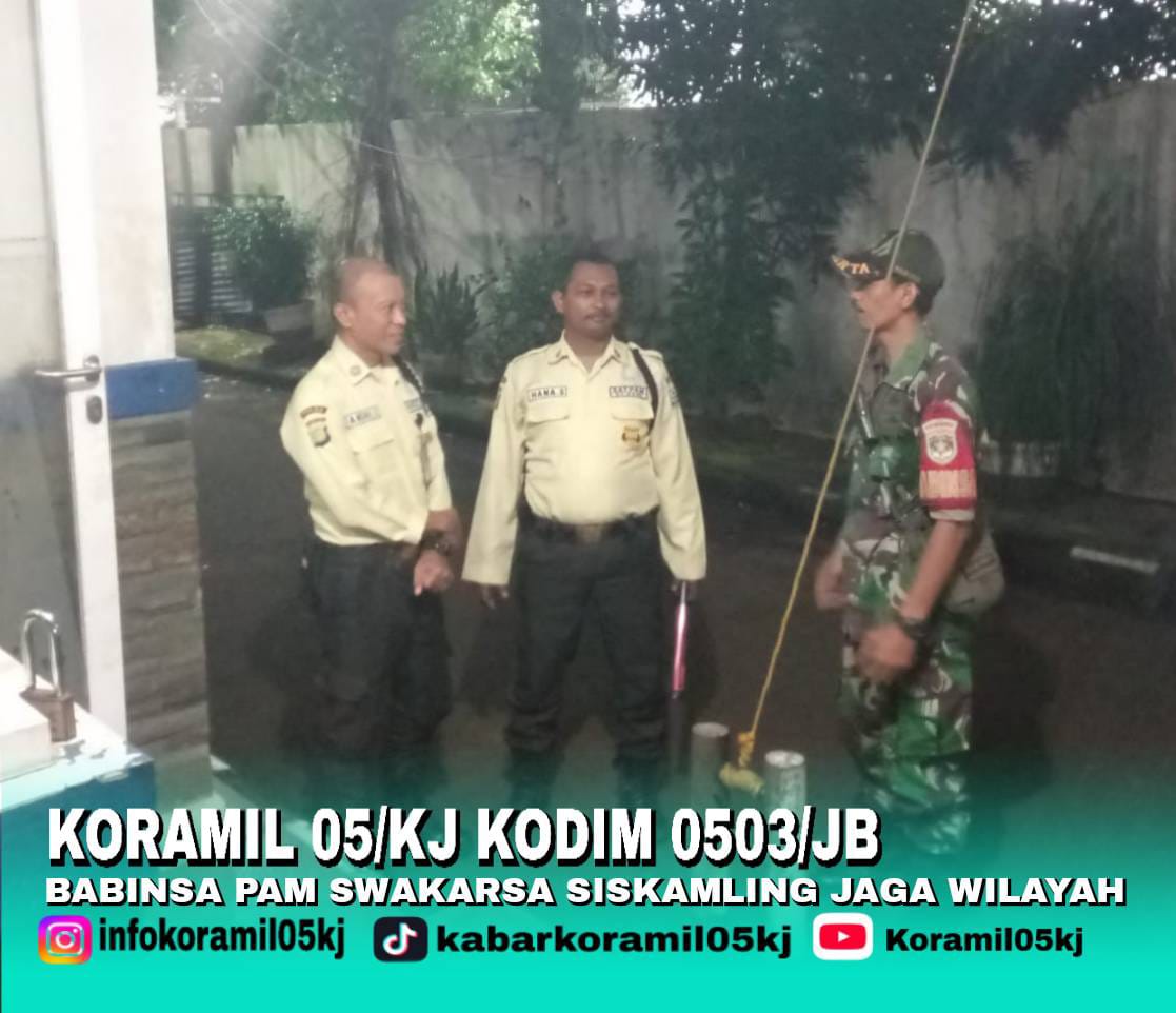 Rakyatmerdekanews.co.id, Jakarta – Babinsa Kelurahan Sukabumi Selatan Serka Triyatno melaksanakan Siskamling/Pam Swakarsa bersama anggota security Komplek Bulog, Anto dan Apriadi yang sedang berjaga dan siaga wilayah.