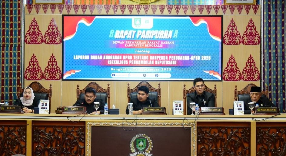Rakyatmerdekanews.co.id, Bengkalis, 29 September 2025 – DPRD Kabupaten Bengkalis melaksanakan rapat paripurna penyampaian laporan Badan Anggaran DPRD tentang Ranperda perubahan APBD Tahun Anggaran 2025 sekaligus pengambilan keputusan. Rapat ini dipimpin langsung oleh Ketua DPRD Kabupaten Bengkalis Septian Nugraha dan didampingi Bupati Bengkalis Kasmarni, Wakil Ketua I M. Arsya Fadillah, Wakil Ketua II Hendrik Firnanda Pangaribuan, dan Wakil Ketua III H. Misno.