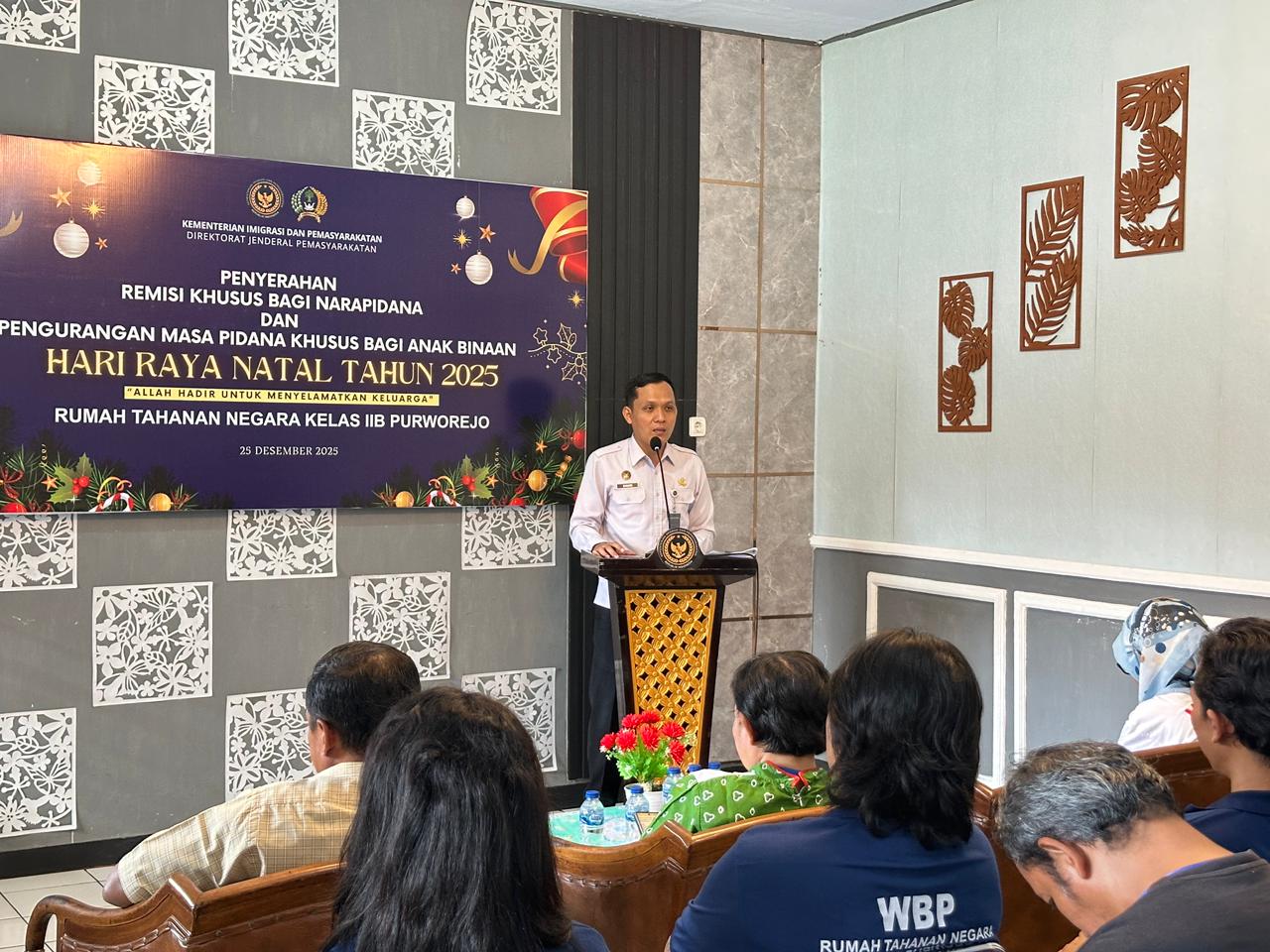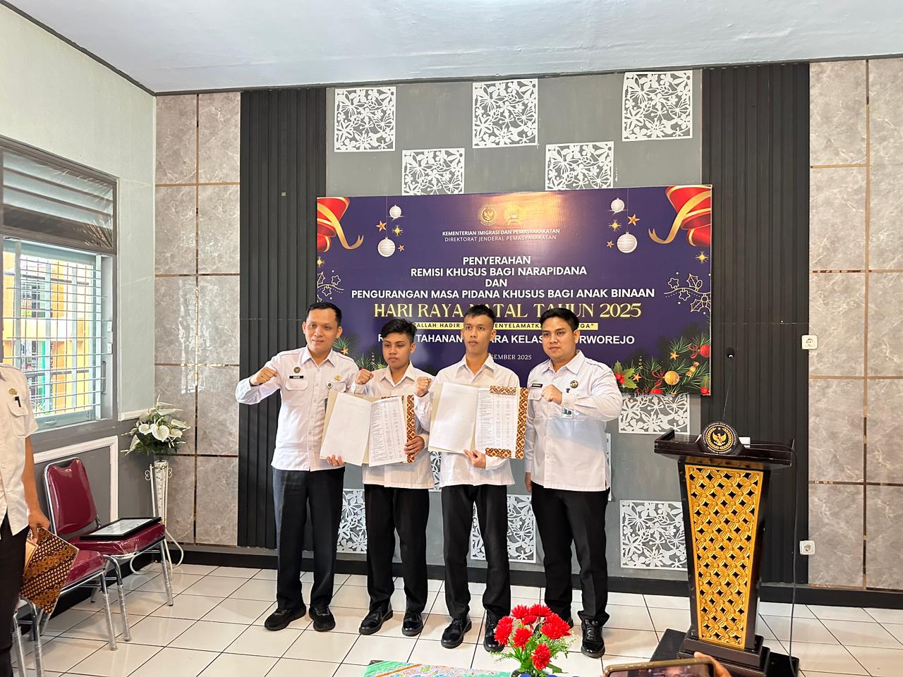 Rakyatmerdekanews.co.id, Purworejo – Sebanyak dua warga binaan pemasyarakatan (WBP) Lapas atau LP Klas IIB Purworejo menerima remisi khusus Hari Raya Natal 2025 berupa pengurangan masa pidana .Satu orang Warga Binaan mendapat remisi selama 15 hari dan seorang lagi mendapat hukuman satu bulan.