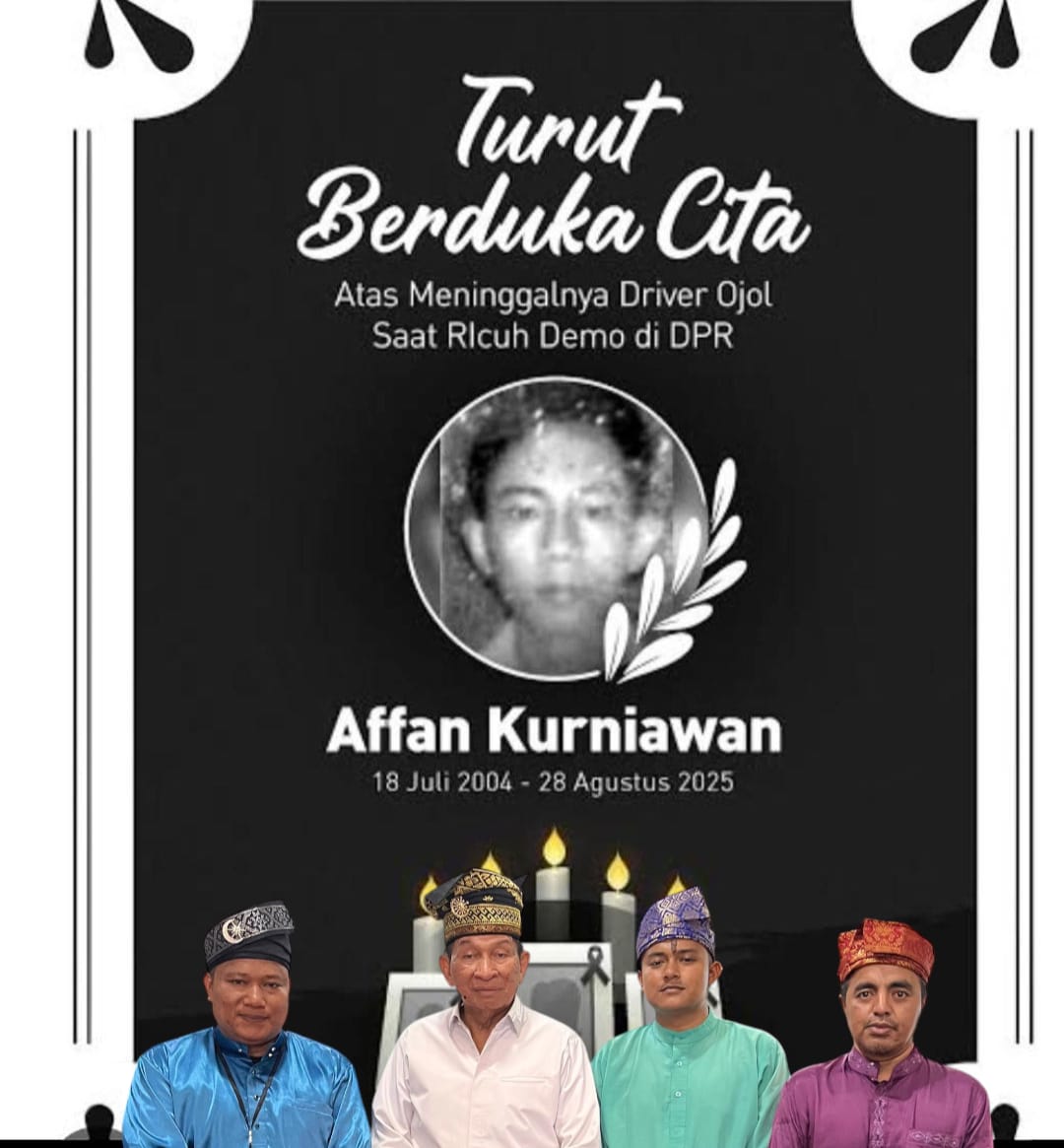 Rakyatmerdekanews.co.id, Kabupaten Bengkalis, Bathin Solapan, 29 Agustus 2025 – Aliansi Anak Melayu mengucapkan turut berbelasungkawa yang sedalam-dalamnya atas berpulangnya saudara kita Affan Kurniawan, salah seorang driver ojek online yang meninggal dunia kemarin pada saat aksi demo buruh yang terjadi di Jakarta.