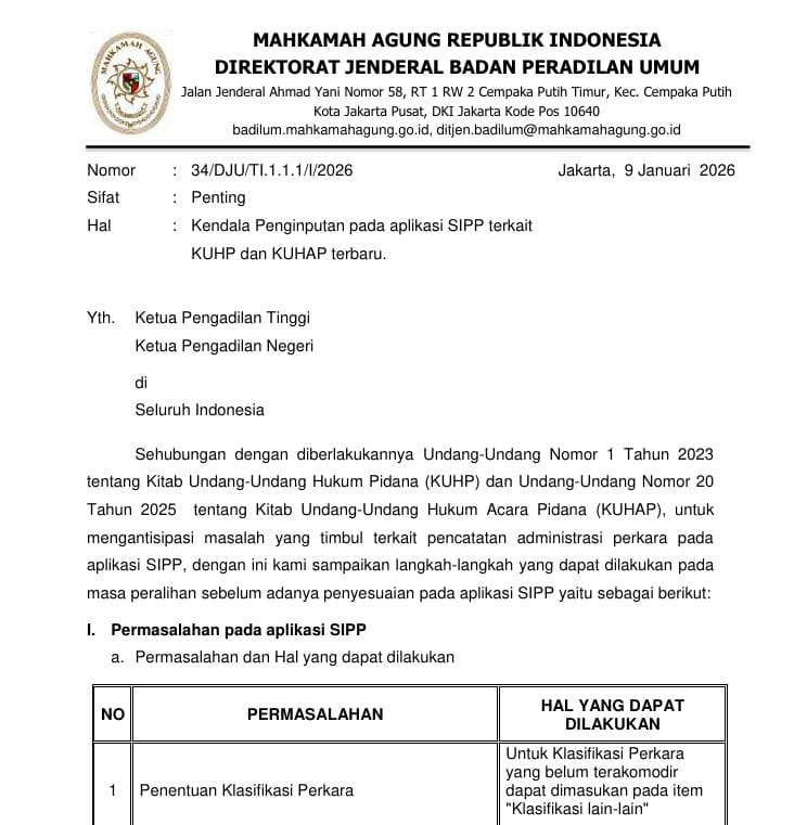 Rakyatmerdekanews.co.id, Jakarta – Direktorat Jenderal Badan Peradilan Umum (Ditjen Badilum) merespon cepat terkait dengan kendala penginputan pada aplikasi sistem informasi penelusuran perkara (SIPP) terkait KUHP dan KUHAP baru sebagaimana surat edaran Nomor 34/DJU/TI.1.1.1/I/2026 pada hari Jumat (9/1).