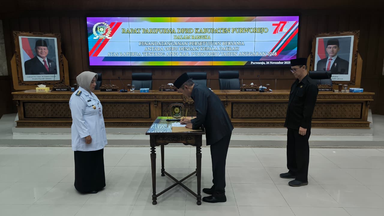 Hasil kesepakatan berlangsung dalam Rapat Paripurna DPRD Kabupaten Purworejo dalam rangka Persetujuan Bersama Antara DPRD dengan Kepala Daerah atas Raperda Tentang Alokasi Pendapatan dan Belanja Daerah (APBD) TA 2026 di Gedung DPRD Purworejo, Rabu (26/11/2025) sore WIB.