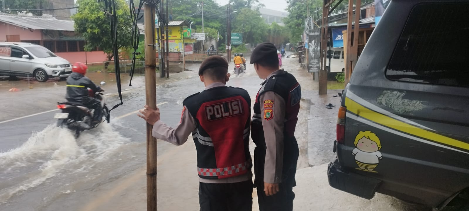 Hujan Deras, Polsek Ciputat Timur Monitoring Banjir di Jalan KH. Dewantoro