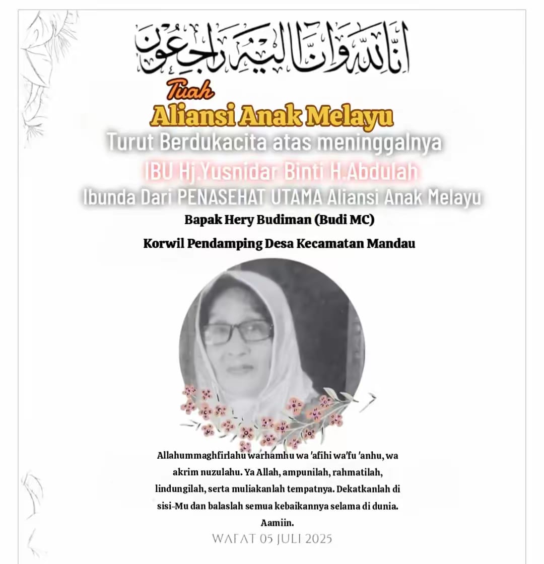 Rakyatmerdekanews.co.id, Bengkalis, 5 Juli 2025 – Aliansi Anak Melayu turut berdukacita atas meninggalnya Ibu Hj. Yusnidar binti H.Abdulah, ibunda dari Bapak Hery Budiman (Budi MC), Korwil Pendamping Desa Kecamatan Mandau, Kabupaten Bengkalis, yang juga menjabat sebagai Penasehat Utama Aliansi Anak Melayu.
