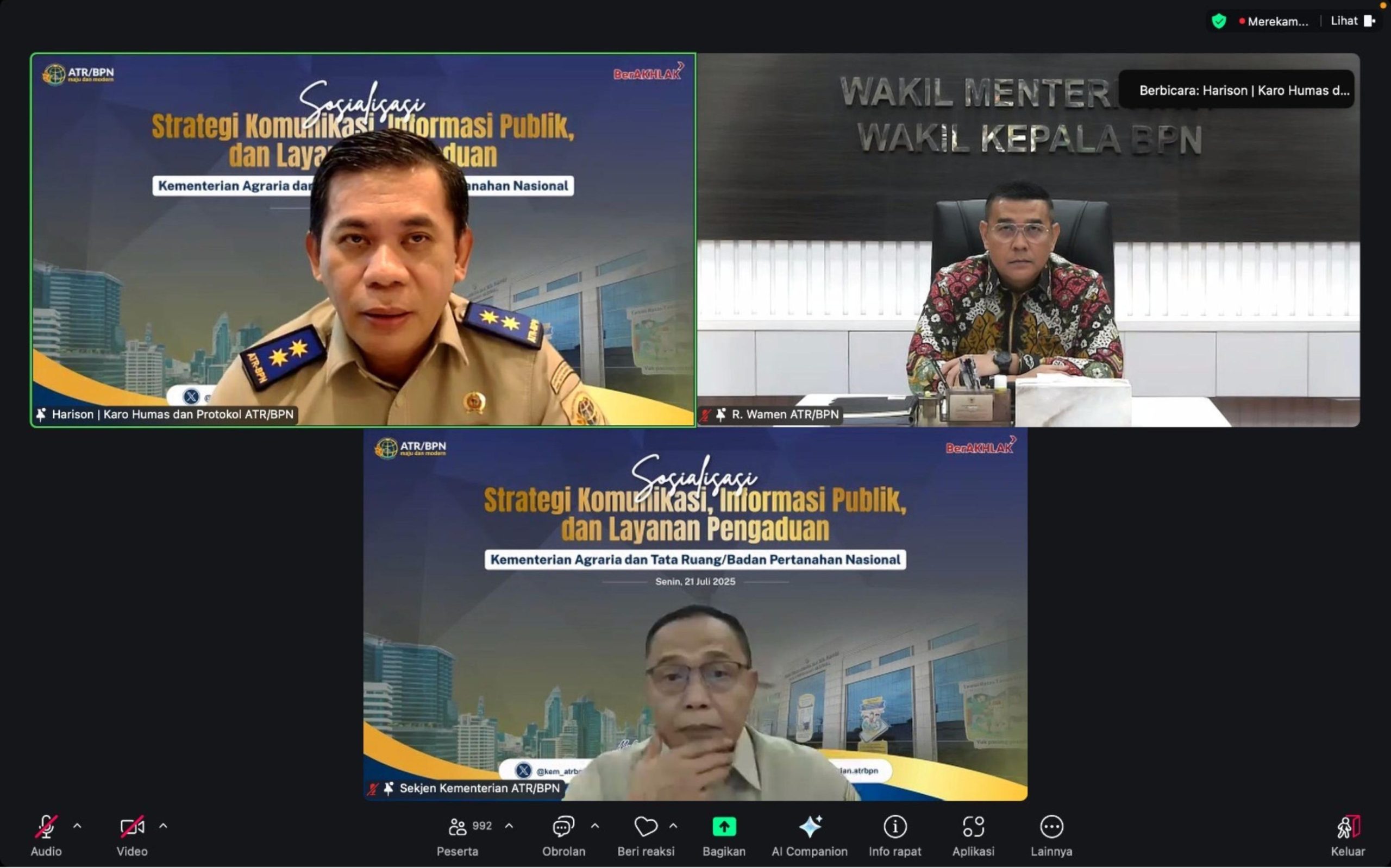 Rakyatmerdekanews.co.id, Jakarta – Dalam Sosialisasi Strategi Komunikasi, Informasi Publik, dan Layanan Pengaduan yang digelar secara daring pada Senin (21/07/2025), Sekretaris Jenderal (Sekjen) Kementerian Agraria dan Tata Ruang/Badan Pertanahan Nasional (ATR/BPN), Pudji Prasetijanto Hadi, menegaskan pentingnya peran jajaran Kantor Wilayah (Kanwil) BPN dan Kantor Pertanahan (Kantah) sebagai perpanjangan tangan kehumasan kementerian di daerah. Untuk menjalankan tugas dan fungsi kehumasan tersebut, ia meminta jajaran di daerah untuk menjaga soliditas internal dan komunikasi eksternal.