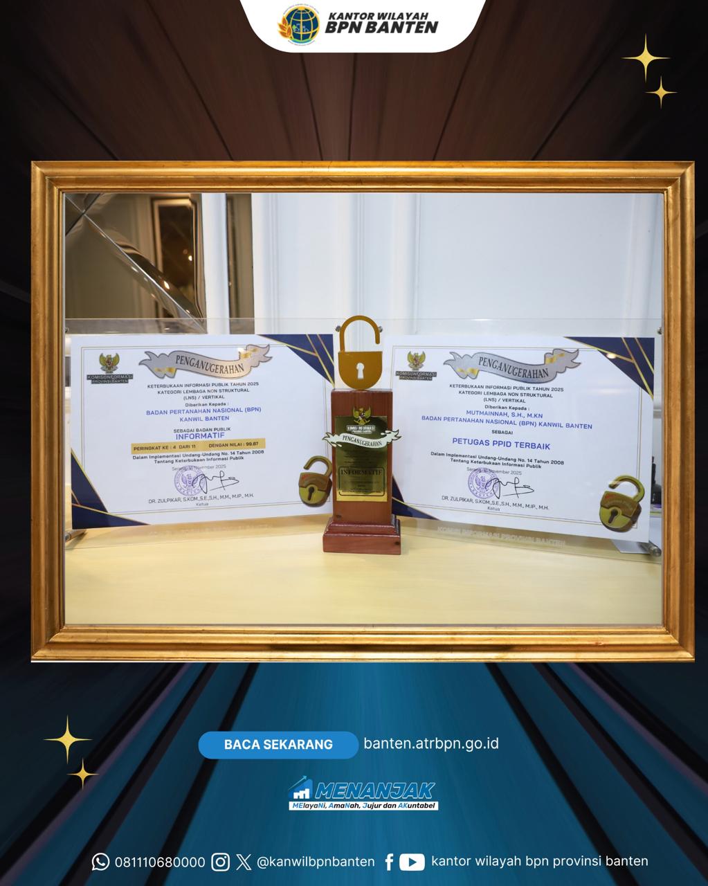 Dalam kesempatan tersebut, Kanwil BPN Provinsi Banten berhasil meraih dua penghargaan sekaligus, yakni sebagai Badan Publik Informatif dan Petugas Pejabat Pengelola Informasi dan Dokumentasi (PPID) Terbaik.