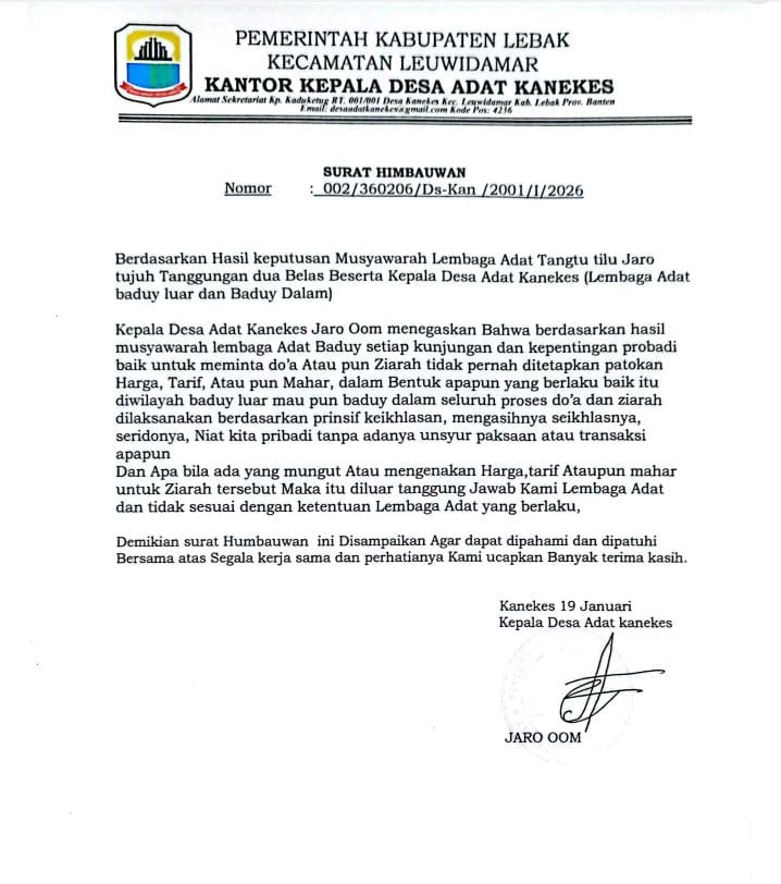 Rakyatmerdekanews.co.id, Lebak, Banten – Kepala Desa Adat Kanekes Jaro Oom melalui surat himbauan bernomor 002/360206/Ds-Kan/2001/I/2026 yang dikeluarkan pada Senin 19 Januari 2026, menegaskan bahwa segala bentuk kepentingan pribadi terkait permintaan bimbingan syariat dan doa, maupun kegiatan ziarah di wilayah Baduy Luar dan Baduy Dalam tidak pernah ditetapkan patokan harga, tarif, atau mahar dalam bentuk apapun.
