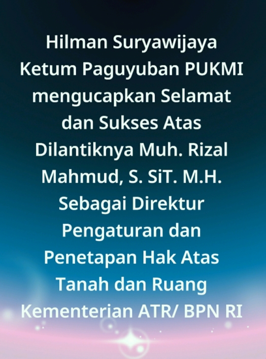 Hilman Suryawijaya Ketum Paguyuban PUKMI mengucapkan Selamat dan Sukses Atas Dilantiknya Muh. Rizal Mahmud, S. SiT. M.H. Sebagai Direktur Pengaturan dan Penetapan Hak Atas Tanah dan Ruang Kementerian ATR/ BPN RI.