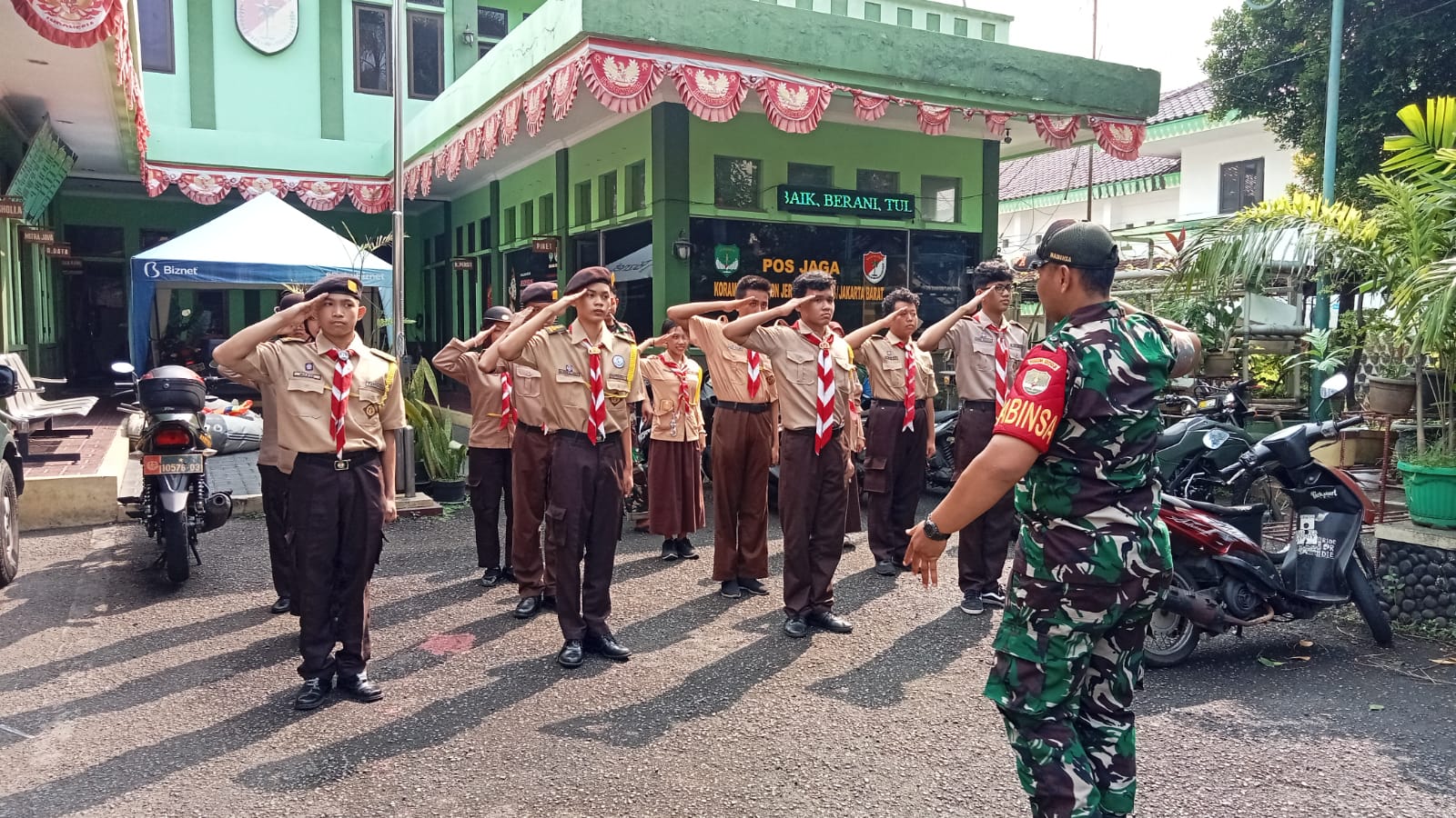 terlihat dua anggota Koramil sedang bersama dengan siswa-siswa berseragam Pramuka.