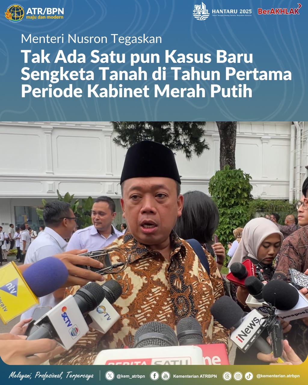 Rakyatmerdekanews.co.id, Jakarta – Menteri Agraria Tata Ruang/Kepala Badan Pertanahan Nasional (ATR/BPN), Nusron Wahid, menegaskan tidak terdapat kasus baru sengketa tanah di tahun pertama periode Pemerintahan Kabinet Merah Putih. Kementerian ATR/BPN akan terus meningkatkan sistem layanan pertanahan dan tata ruang yang akuntabel demi mencegah adanya sengketa tanah yang merugikan masyarakat.