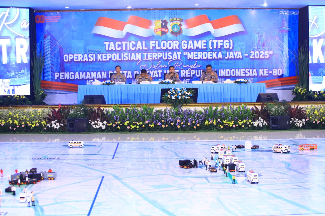 Rakyatmerdekanews.co.id, Jakarta – Polri menggelar Tactical Floor Game (TFG) Operasi Terpusat Merdeka Jaya 2025, dalam rangka pengamanan rangkaian kegiatan kenegaraan hingga Pesta Rakyat HUT ke-80 Republik Indonesia. TFG digelar di Aula Gedung BPMJ Polda Metro Jaya, Kamis (14/8/2025), yang dipimpin Astamaops Kapolri Komjen Akhmad Wiyagus, Kakorlantas Polri Irjen Agus Suryonugroho hingga Kapolda Metro Jaya Irjen Karyoto.