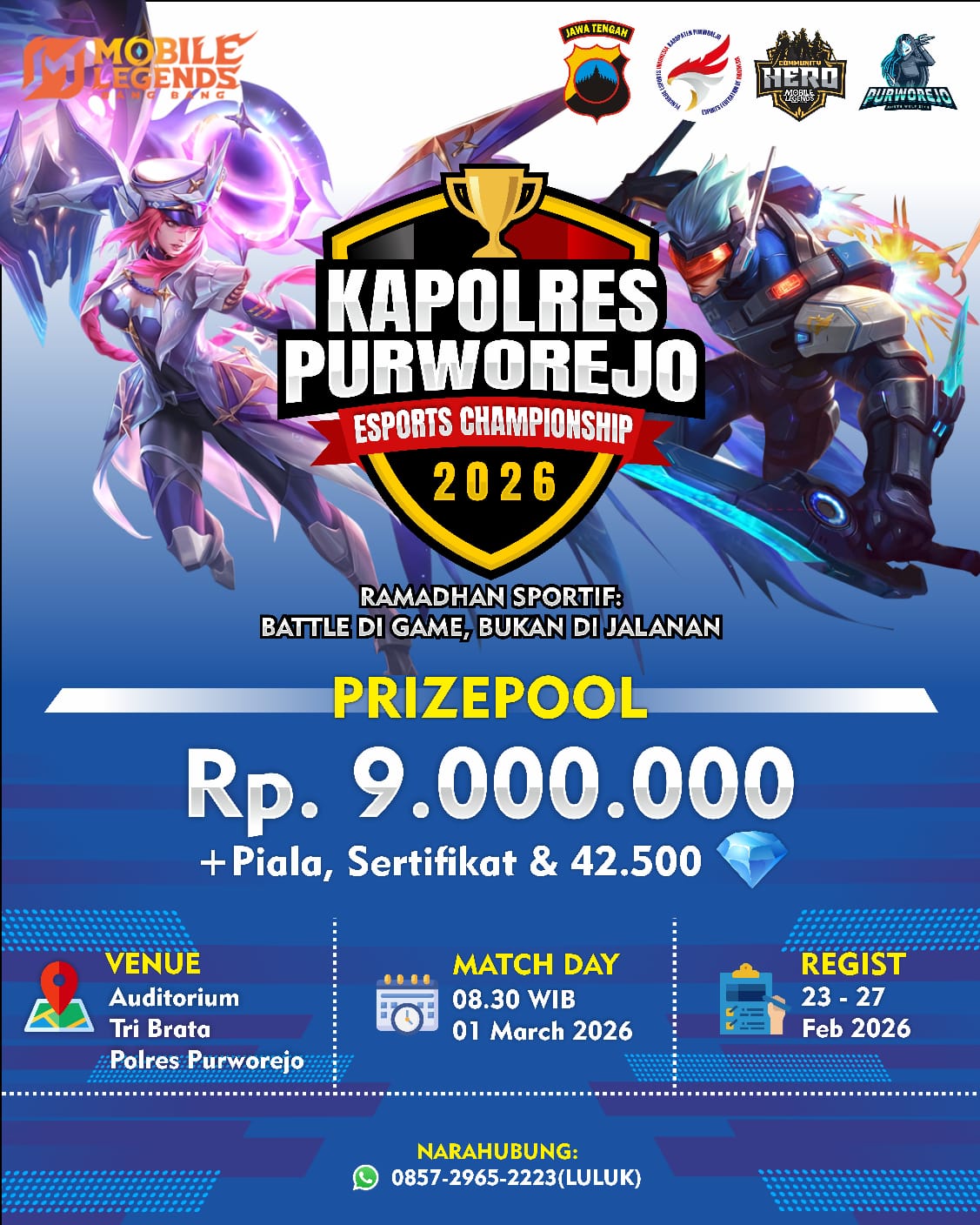 Rakyatmerdekanews.co.id, Purworejo – Polres Purworejo akan menggelar Turnamen Ramadhan E-Sport Championship 2026 pada Minggu, 1 Maret 2026, di Auditorium Tribrata Polres Purworejo. Kegiatan yang berlangsung mulai pukul 08.00 hingga 17.00 WIB ini mengusung tagline “Ramadhan Sportif: Battle di Game, Bukan di Jalanan.”