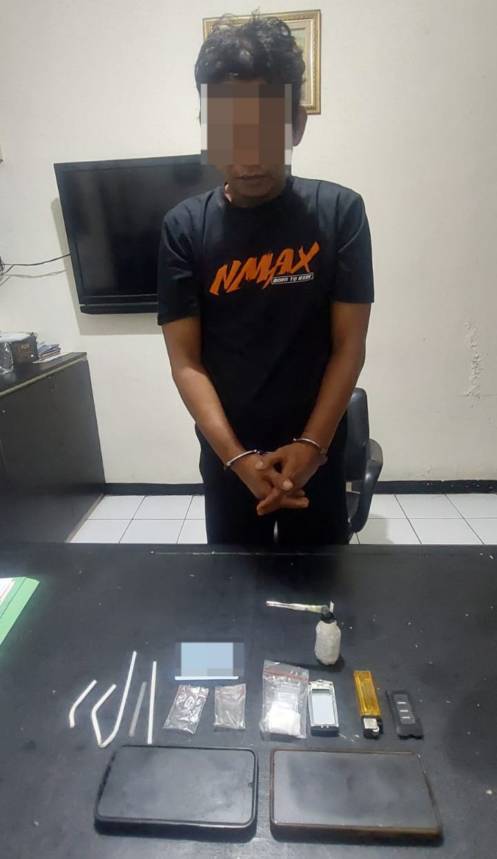 Dari tangan pelaku, polisi mengamankan sejumlah barang bukti berupa 1 buah tas selempang warna hitam, 1 buah timbangan digital, 1 buah bong atau alat hisap sabu dengan 2 pipet, 4 buah sedotan plastik warna putih yang telah dipotong, serta 1 bungkus plastik klip bening berisi 12 bungkus plastik klip bening yang diduga berisi narkotika jenis sabu dengan berat bruto 2,2 gram.