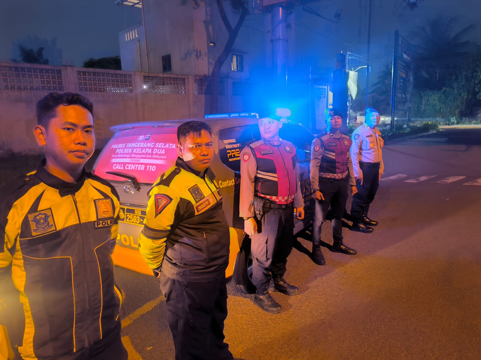 Patroli diawali dengan apel kesiapan di halaman Polsek Kelapa Dua sebagai bentuk pengecekan personel dan arahan pelaksanaan tugas.