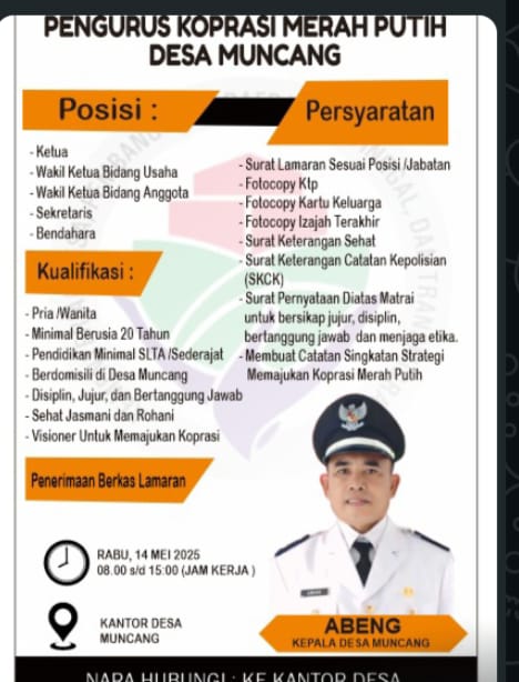Rakyatmerdekanews, Lebak – Pemerintah Desa Muncang, Kecamatan Muncang, Kabupaten Lebak, telah membuka rekrutmen calon pengurus Koperasi Desa Merah Putih. Program ini merupakan bagian dari upaya penguatan ekonomi kerakyatan di tingkat desa dan mendukung visi pemerintahan Presiden Prabowo Subianto dalam membangun ekonomi desa berbasis koperasi.