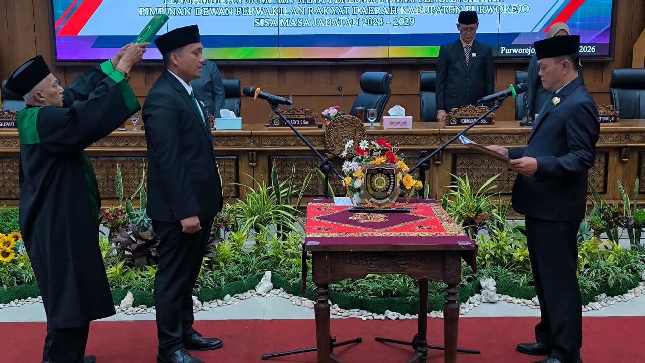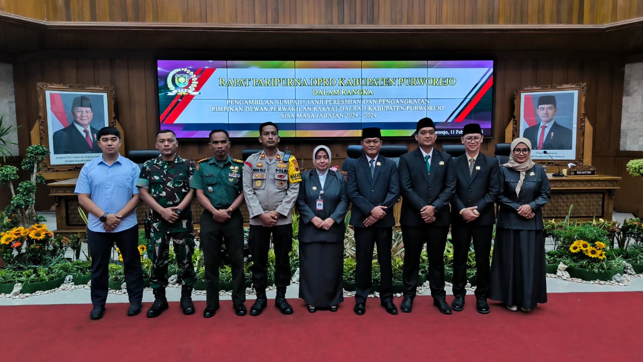 Prosesi pengambilan sumpah/janji dan peresmian pengangkatan pimpinan DPRD Kabupaten Purworejo masa jabatan 2024–2029 berlangsung khidmat. Acara tersebut dihadiri langsung oleh Bupati Purworejo Yuli Hastuti, jajaran Forum Koordinasi Pimpinan Daerah (Forkopimda), pimpinan Organisasi Perangkat Daerah (OPD), serta sejumlah tamu undangan lainnya.