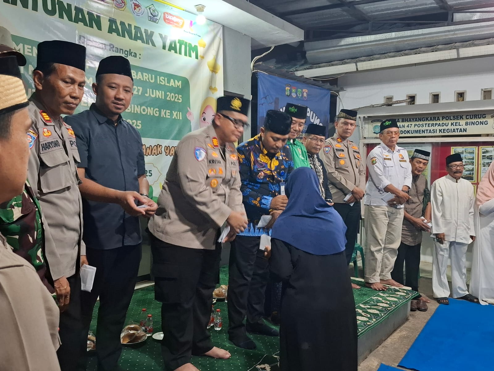 Acara diawali dengan pembukaan, doa bersama, dilanjutkan sambutan dari para tokoh dan penyerahan santunan kepada anak-anak yatim. Ketua Pos Terpadu Binong, Bapak Sugiarto, BSc menyampaikan bahwa kegiatan santunan ini telah menjadi tradisi selama 12 tahun terakhir. Ia juga mengapresiasi soliditas tiga pilar (Polri, TNI, dan pemerintah daerah) dalam menjaga keamanan dan keharmonisan masyarakat di Kelurahan Binong.