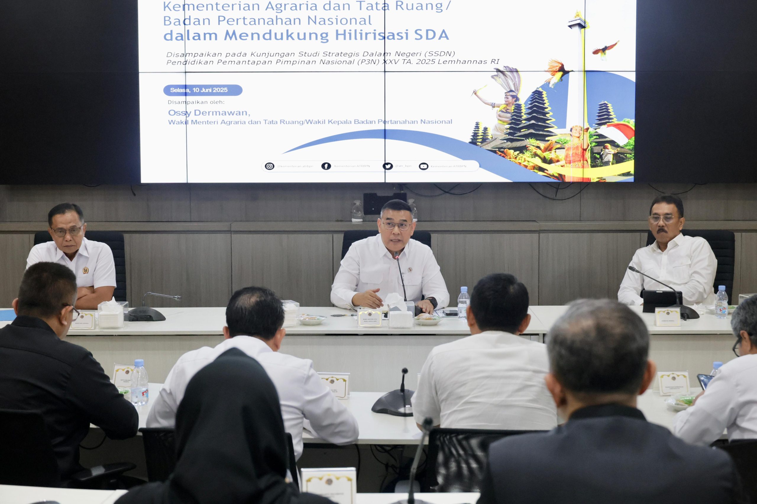 Rakyatmerdekanews.co.id, Jakarta – Wakil Menteri Agraria dan Tata Ruang/Wakil Kepala Badan Pertanahan Nasional (Wamen ATR/Waka BPN), Ossy Dermawan, menerima Kunjungan Studi Strategis Dalam Negeri (SSDN) Pendidikan Pemantapan Pimpinan Nasional (P3N) XXV Tahun Anggaran 2025 dari Lembaga Ketahanan Nasional Republik Indonesia (LEMHANNAS RI) pada Selasa (10/06/2025). Di hadapan para peserta P3N, ia menjelaskan terkait tugas dan fungsi Kementerian ATR/BPN dalam hilirisasi sumber daya.