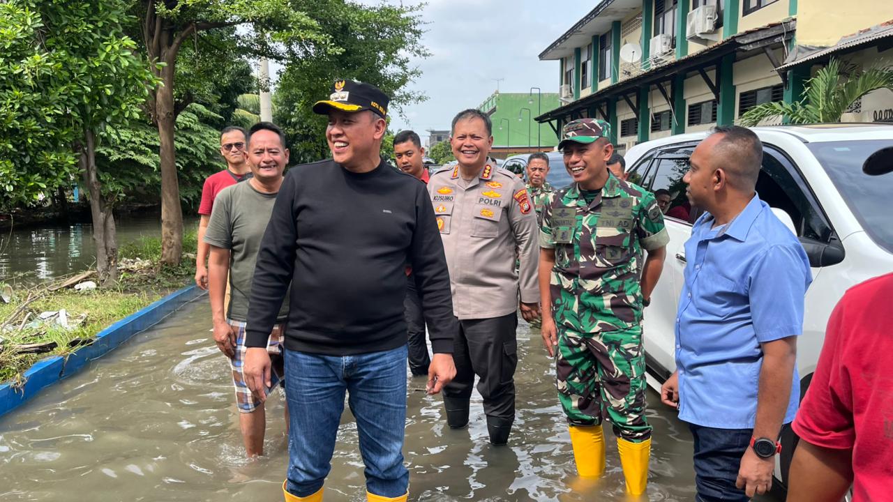 Selanjutnya, Wali Kota Bekasi bersama Dandim dan Kapolres meninjau langsung banjir di Perumahan Duren Jaya. Di lokasi tersebut, Tri Adhianto tampak menyapa dan memberi semangat kepada anak-anak yang berkumpul di tengah situasi banjir, sembari mengingatkan agar tetap menjaga kesehatan dan keselamatan.