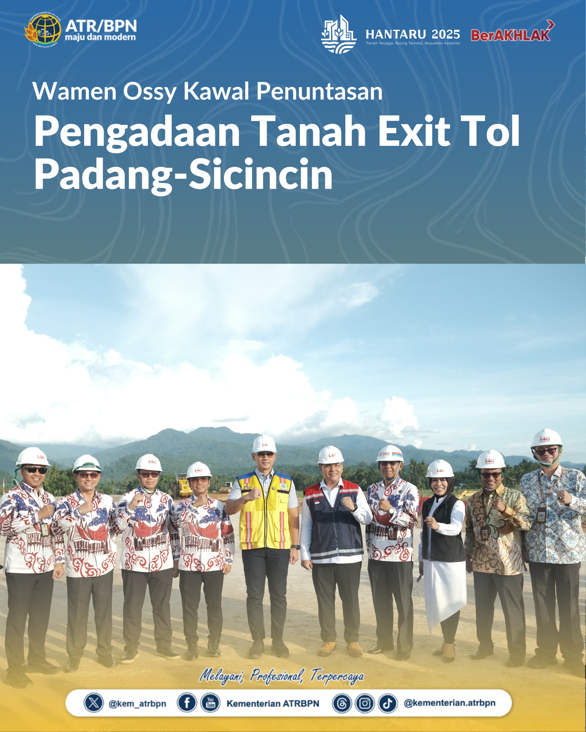 Rakyatmerdekanews.co.id, Padang – Kementerian Agraria dan Tata Ruang/Badan Pertanahan Nasional (ATR/BPN) lanjut memproses dokumen bukti kepemilikan masyarakat untuk pengadaan tanah Exit Tol Padang-Sicincin yang terletak di Nagari Lubuk Alung, Kabupaten Padang Pariaman. Hal itu dilakukan agar hasil dari proses pengadaan tanah prudent. Hal ini disampaikan oleh Wakil Menteri (Wamen) ATR/Wakil Kepala (Waka) BPN, Ossy Dermawan, saat meninjau Tol Padang-Sicincin, Selasa (30/09/2025).